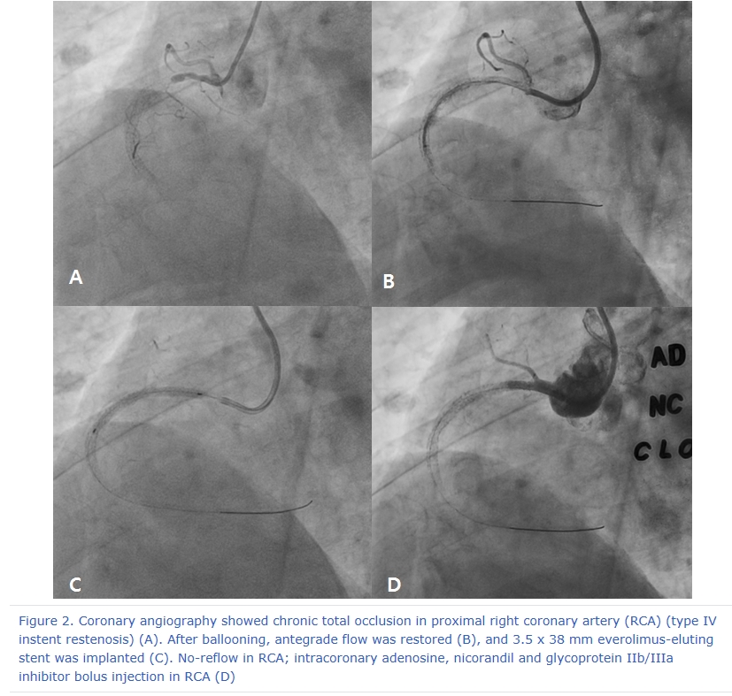 Figure 2. Coronary angiography showed chronic total occlusion in proximal right coronary artery (RCA) (type IV instent restenosis) (A). After ballooning, antegrade flow was restored (B), and 3.5 x 38 mm everolimus-eluting stent was implanted (C). No-reflow in RCA; intracoronary adenosine, nicorandil and glycoprotein IIb/IIIa inhibitor bolus injection in RCA (D) |
