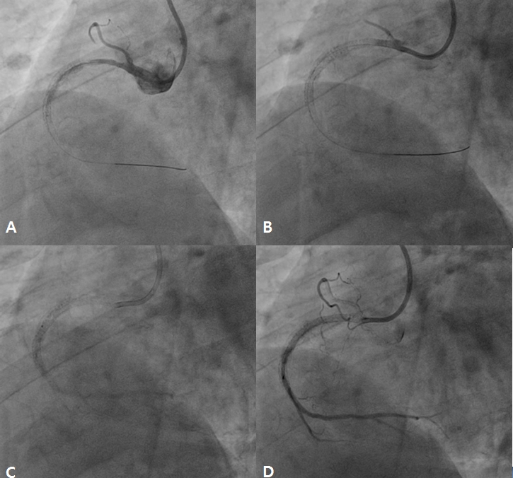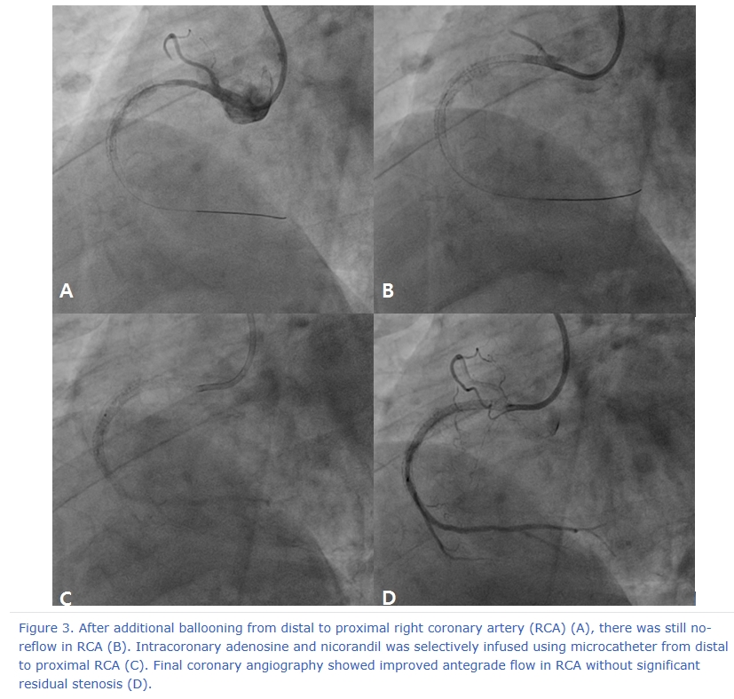 Figure 3. After additional ballooning from distal to proximal right coronary artery (RCA) (A), there was still no-reflow in RCA (B). Intracoronary adenosine and nicorandil was selectively infused using microcatheter from distal to proximal RCA (C). Final coronary angiography showed improved antegrade flow in RCA without significant residual stenosis (D). |