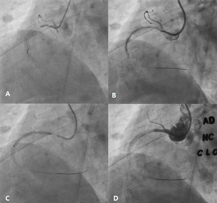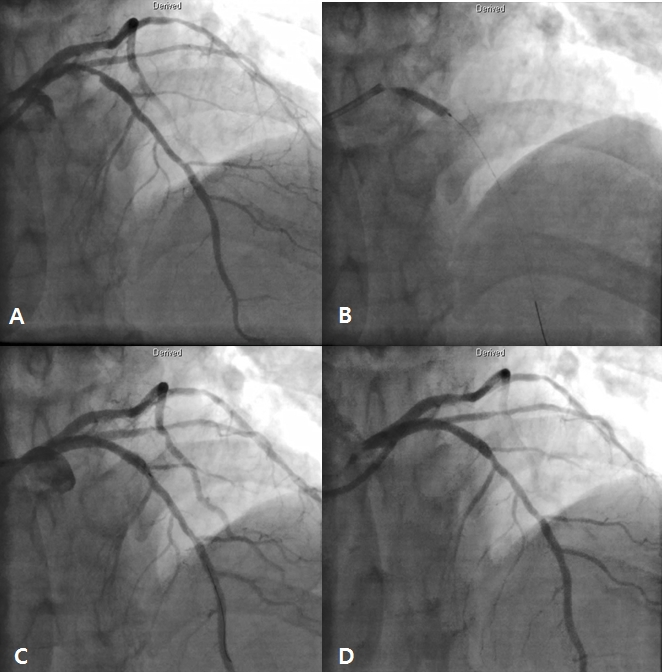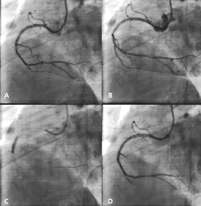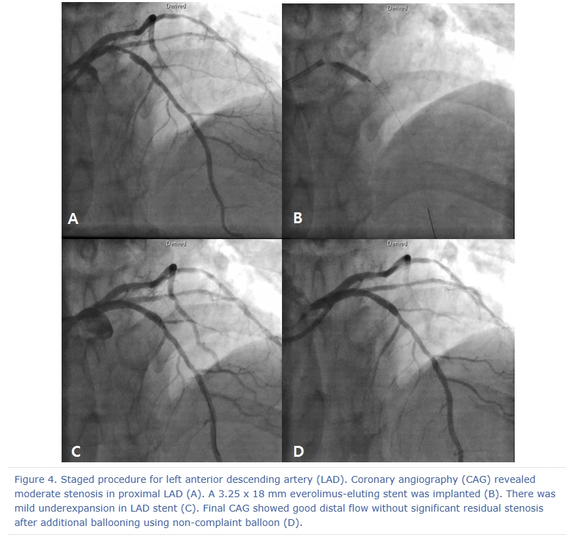 Figure 4. Staged procedure for left anterior descending artery (LAD). Coronary angiography (CAG) revealed moderate stenosis in proximal LAD (A). A 3.25 x 18 mm everolimus-eluting stent was implanted (B). There was mild underexpansion in LAD stent (C). Final CAG showed good distal flow without significant residual stenosis after additional ballooning using non-complaint balloon (D). |
