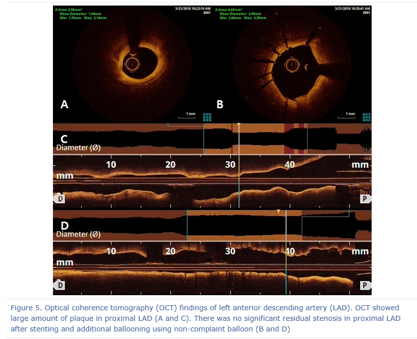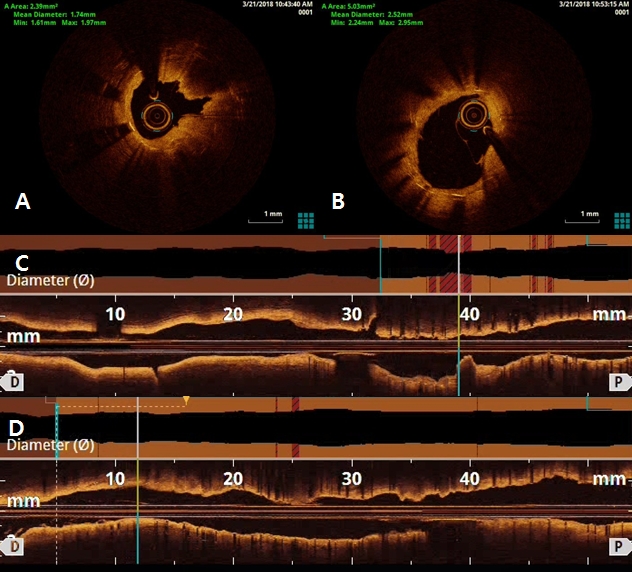 Figure 5. Optical coherence tomography (OCT) findings of left anterior descending artery (LAD). OCT showed large amount of plaque in proximal LAD (A and C). There was no significant residual stenosis in proximal LAD after stenting and additional ballooning using non-complaint balloon (B and D) |