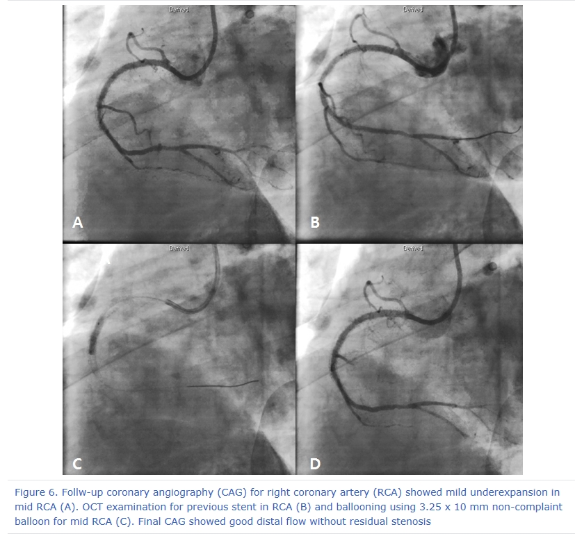Figure 6. Follw-up coronary angiography (CAG) for right coronary artery (RCA) showed mild underexpansion in mid RCA (A). OCT examination for previous stent in RCA (B) and ballooning using 3.25 x 10 mm non-complaint balloon for mid RCA (C). Final CAG showed good distal flow without residual stenosis |