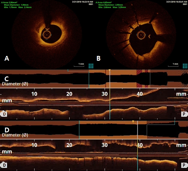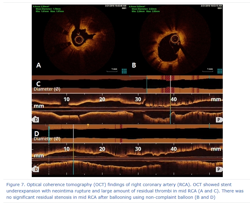 After 3 days later, we performed 2nd stage PCI for proximal LAD. CAG reveled moderate stenosis in proximal LAD (Figure 4A), so we examined optical coherence tomography (OCT) for further evaluation. It showed large amount of plaque (minimal lumen area [MLA] 2.62 mm2) (Figure 5A and 5C). We directly implanted 3.25 and 18 mm everolimus-eluting stent (Xience Alpine®), but follow-up CAG showed mild under-expansion, so we did additional ballooning using 3.25 x 10mm non-complaint balloon (Figure 4B and 4C). Follow-up OCT and CAG showed good distal flow without significant residual stenosis. (post-PCI cross sectional area [CSA] 6.65 mm2) (Figure 4D, 5B and 5D). Because of no-reflow phenomenon for RCA in previous PCI, we performed follow-up CAG and OCT for RCA. CAG and OCT showed stent underexpansion with neointima rupture and large amount of residual thrombi in mid RCA (MLA 2.39 mm2) (Figure 6A, 6B, 7A and 7C). So we did ballooning using 3.25 x 10 mm non-complaint balloon for mid RCA (Figure 6C). Follow-up CAG and OCT showed good distal flow without significant residual stenosis. (CSA 5.03 mm2) (Figure 6D, 7B and 7D). He was discharged without any complications.