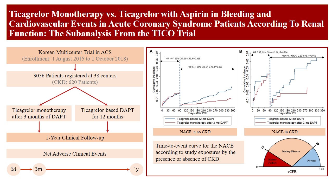 (2025.9) Ticagrelor Monotherapy vs. Ticagrelor With Aspirin in Bleeding and Cardiovascular Events in Acute Coronary Syndrome Patients According to Renal Function: The Subanalysis From the TICO Trial 저자:Ji Hyun Lee, MD,1 Hyeonju Jeong, MD,1 Eui-Seock Hwang, MD,1...